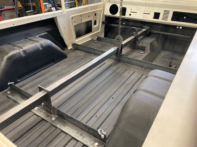 The Backbone gantry lift bracket kit delivers precision engineering for early Bronco body work. Each plasma-cut bracket is engineered to exact specifications, removing uncertainty from the lifting process. The kit includes a comprehensive materials guide enabling you to source structural components through local steel suppliers, maintaining quality control throughout your build. Built for serious restorers, this system combines professional-grade accuracy with practical accessibility, transforming a complex fabrication challenge into a straightforward assembly process.